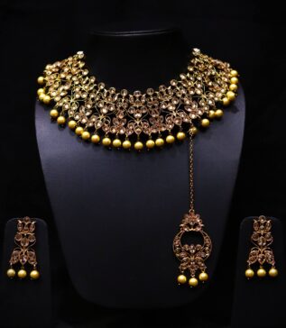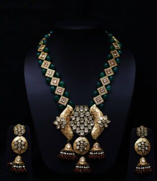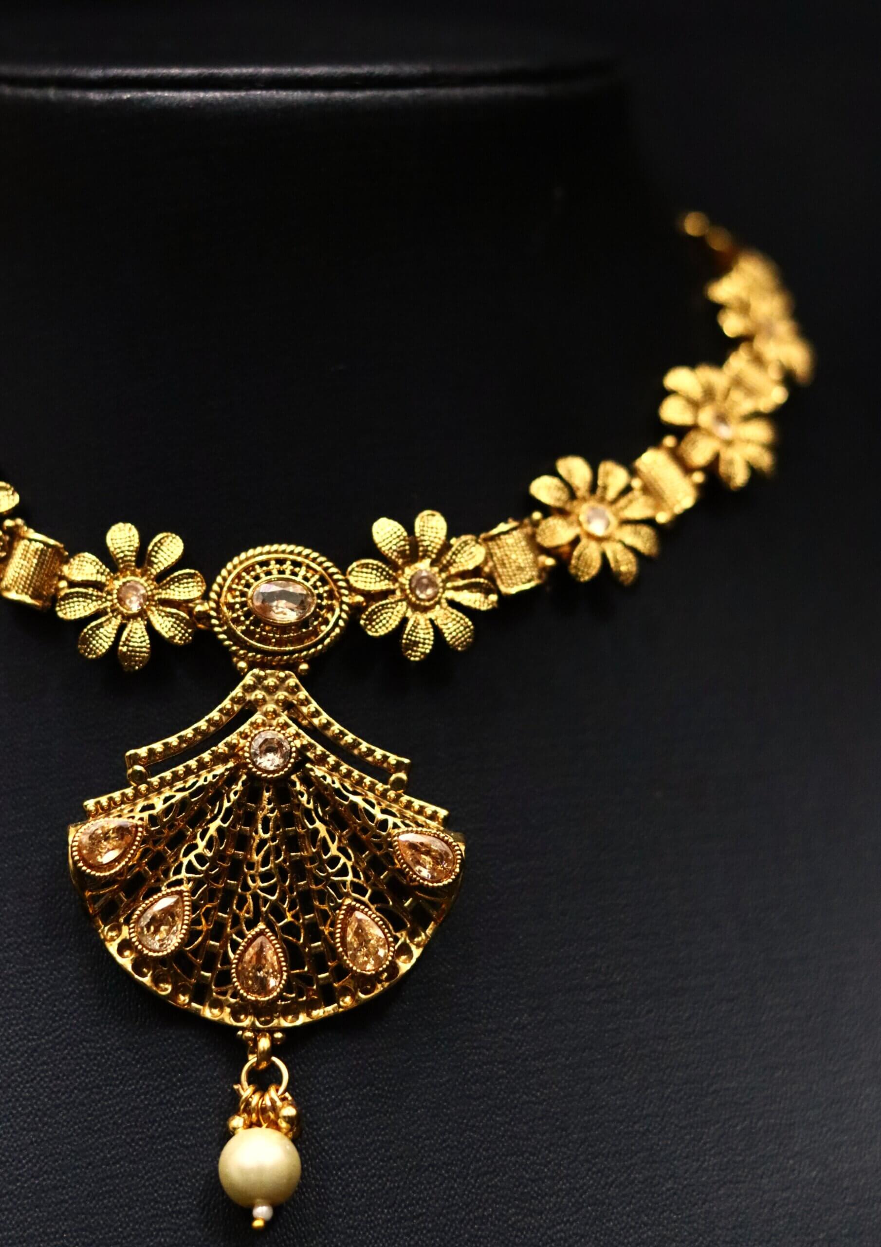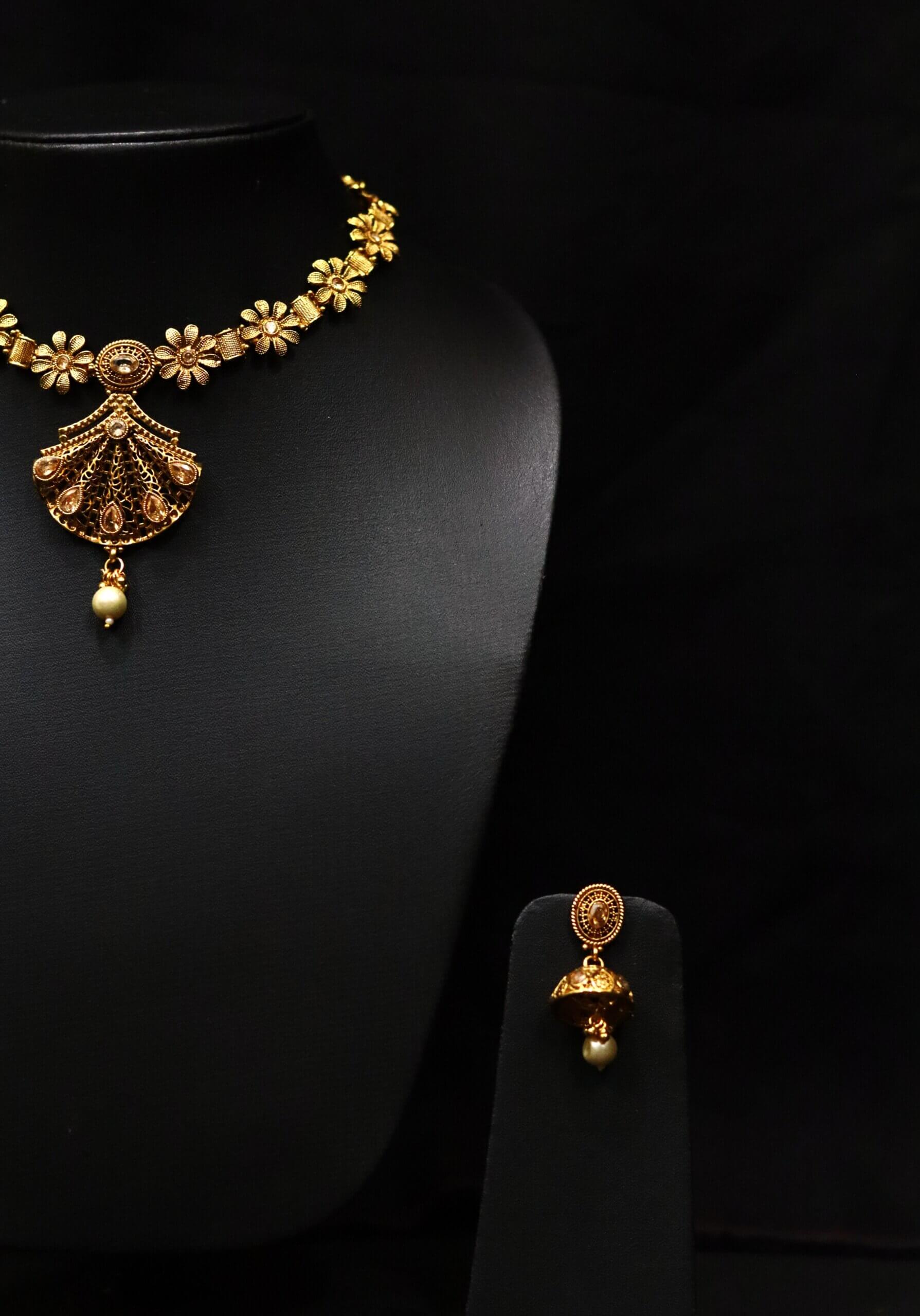 Crafted with rows of softly sculpted floral motifs, this mid-length necklace is anchored by an elegant crescent-shaped pendant with intricate lattice work and a pearl drop. The antique finish and subtle gold tone bring an old-world richness, perfectly balanced with matching jhumka-style earrings. A versatile piece that pairs beautifully with both festive and bridal ensembles.