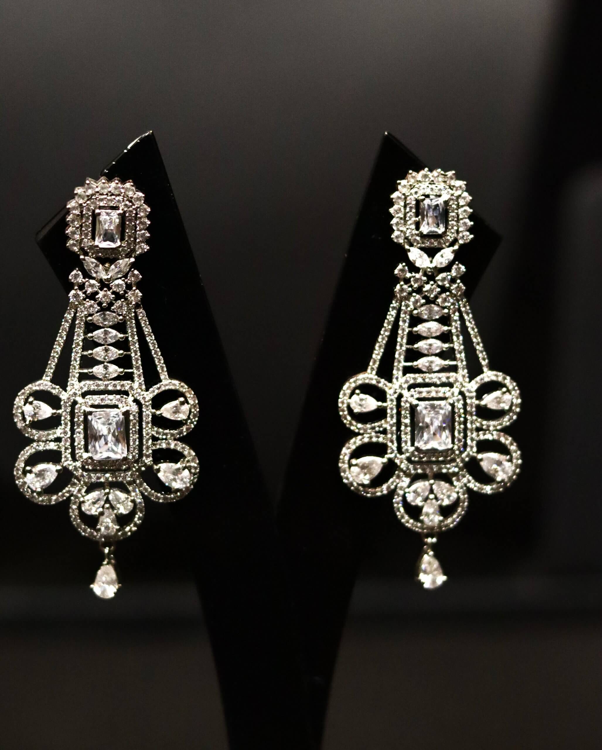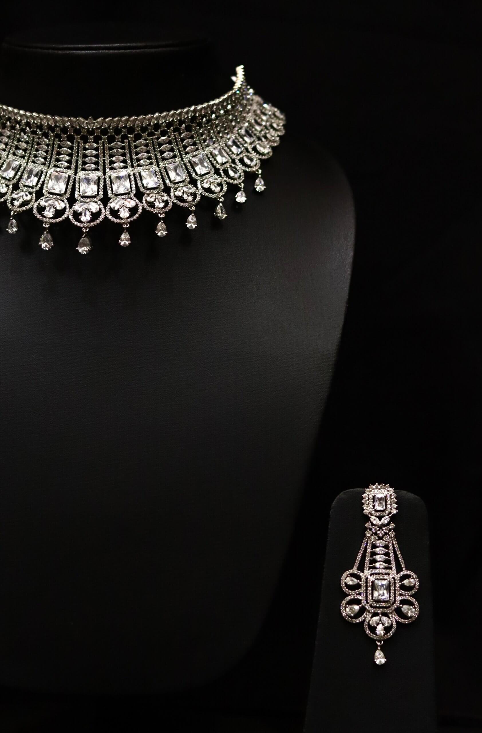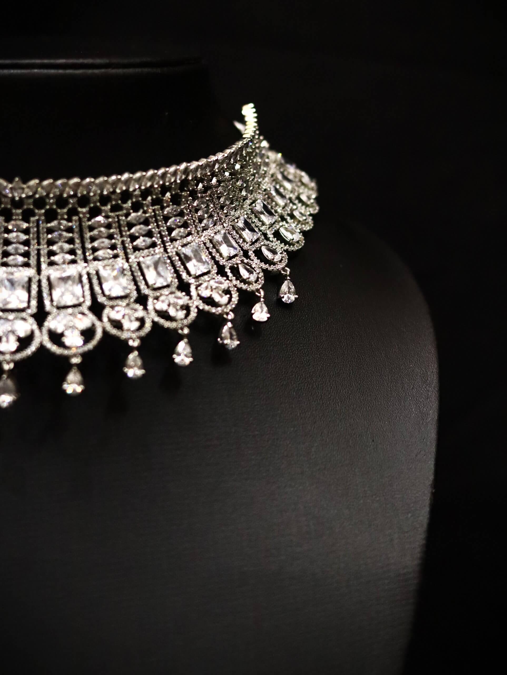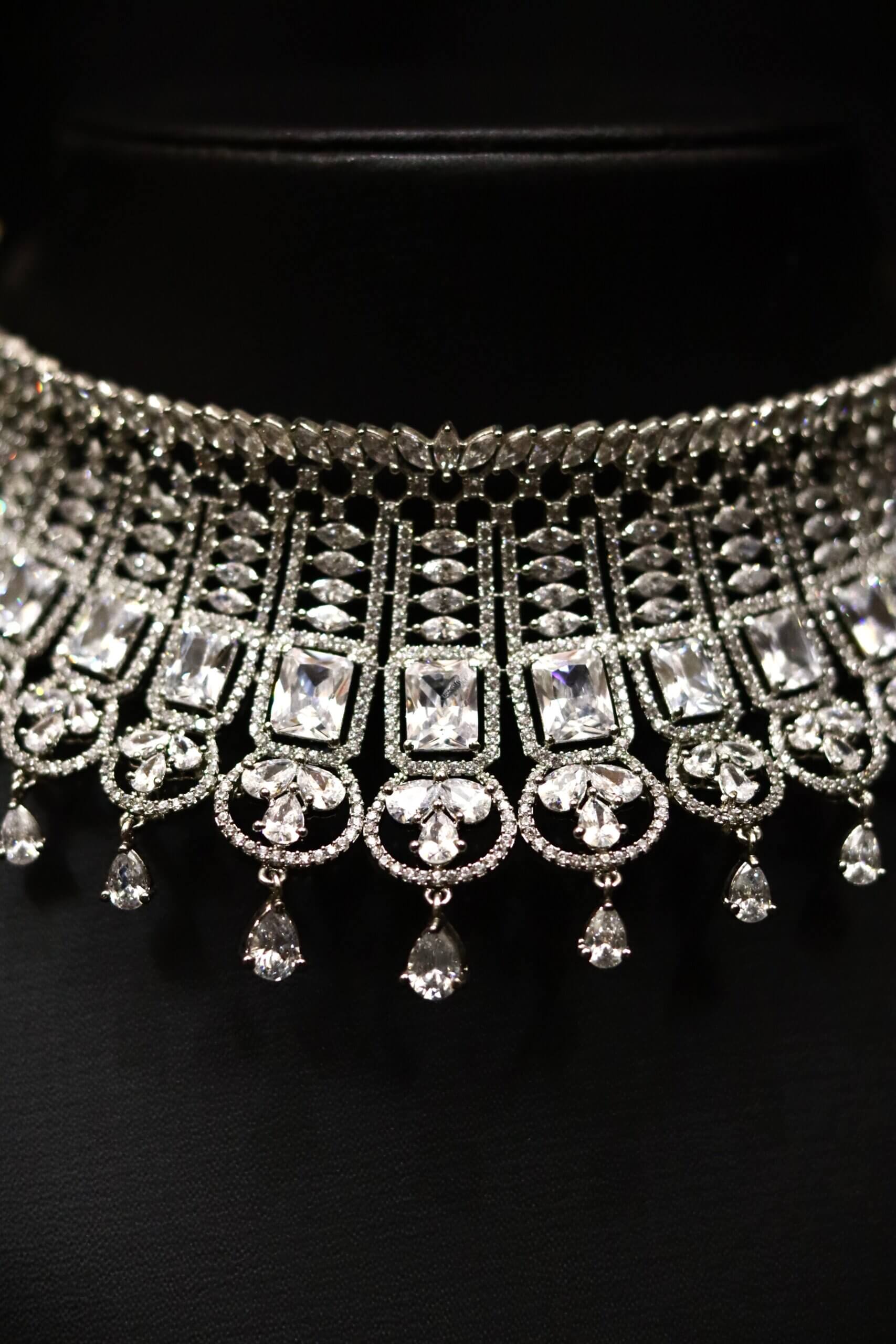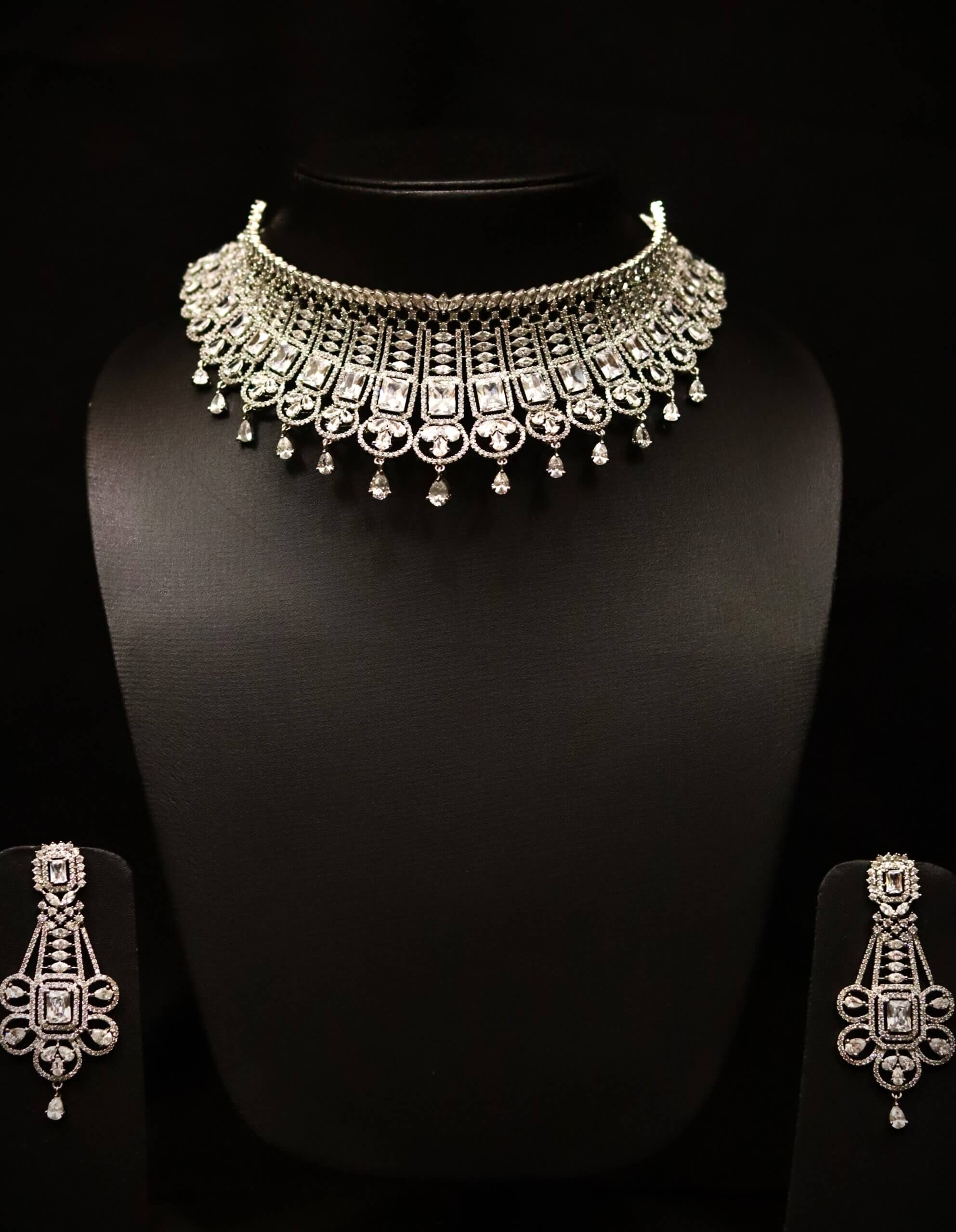 A radiant silver-finish necklace set adorned with shimmering white stones in a regal silhouette.