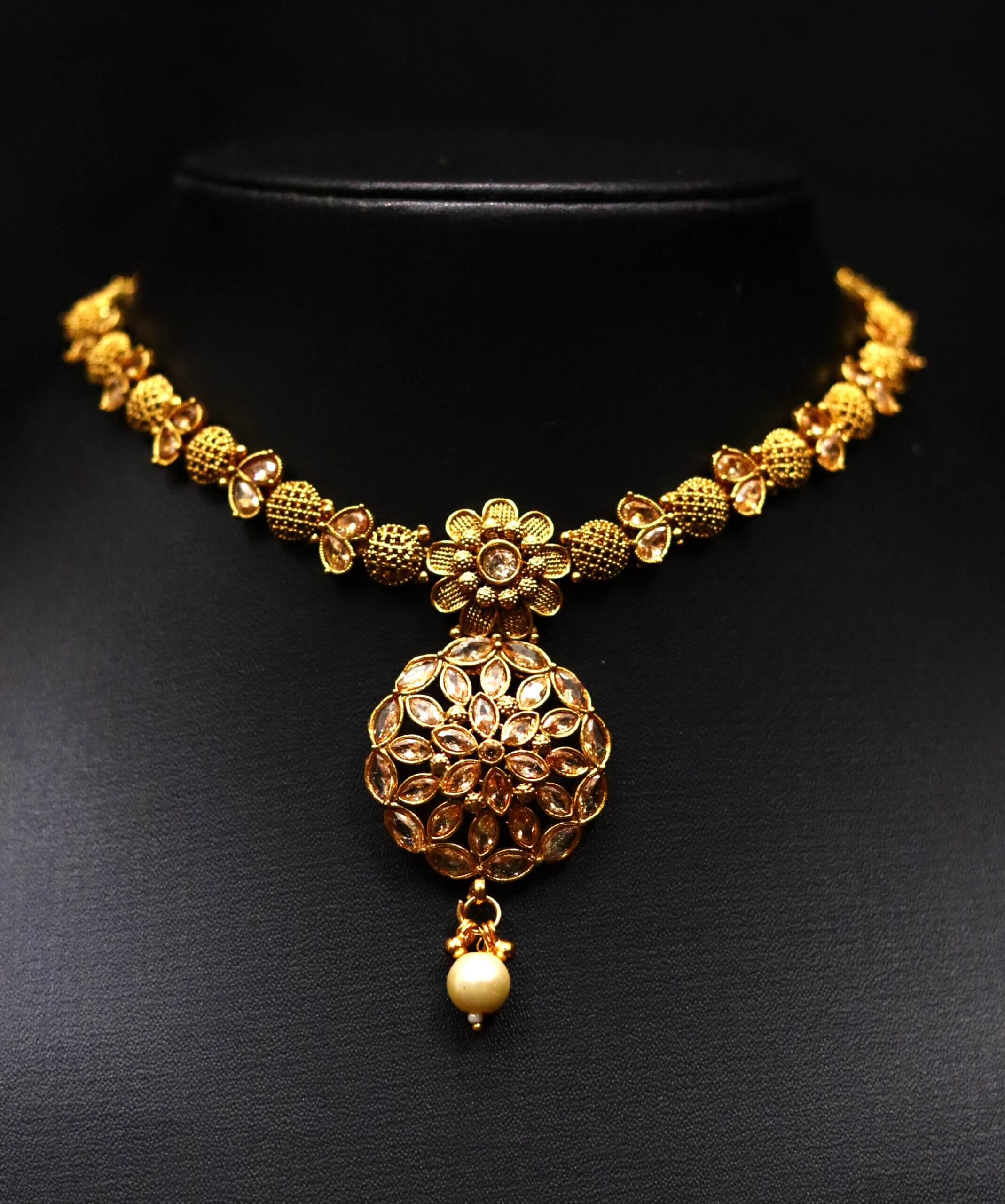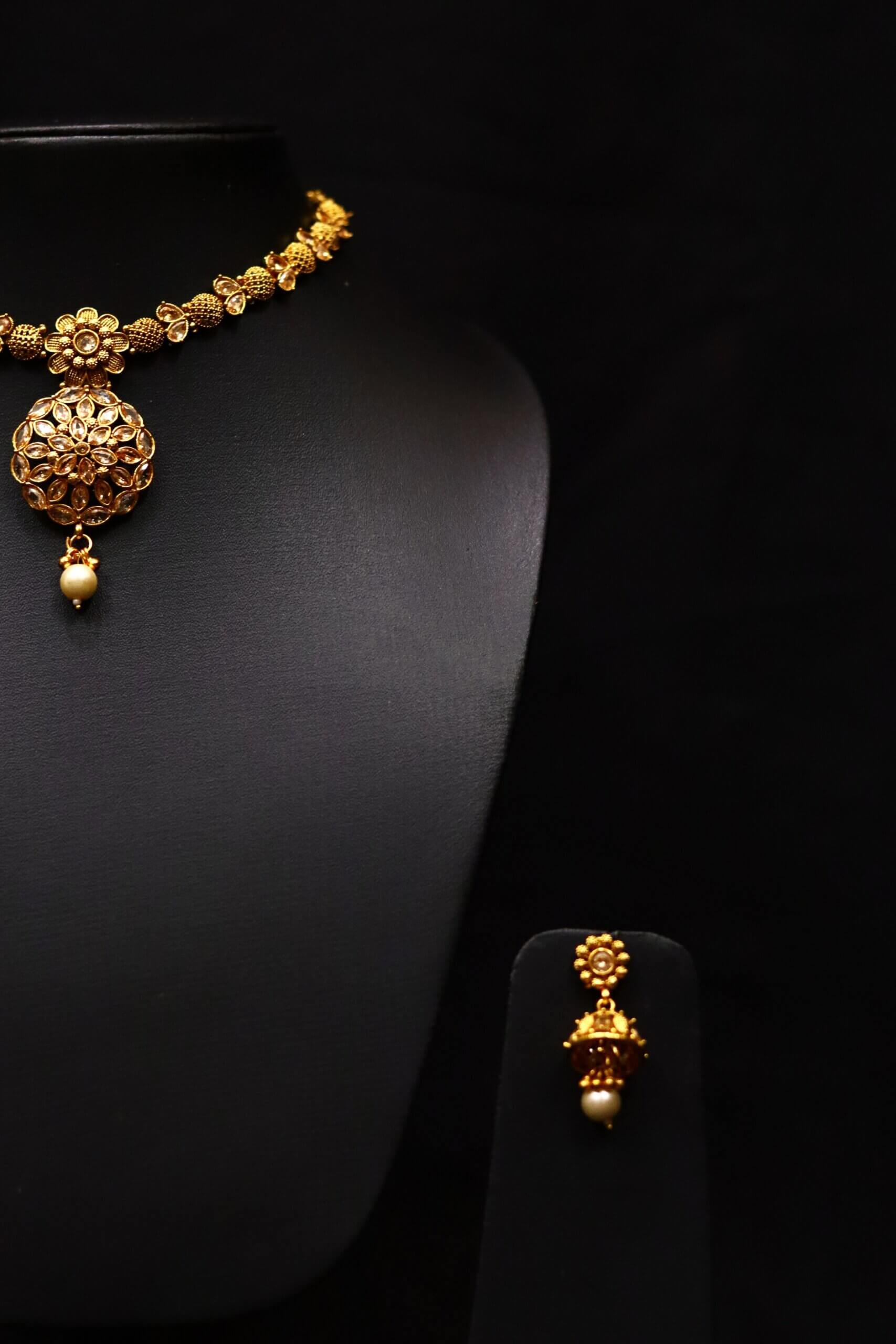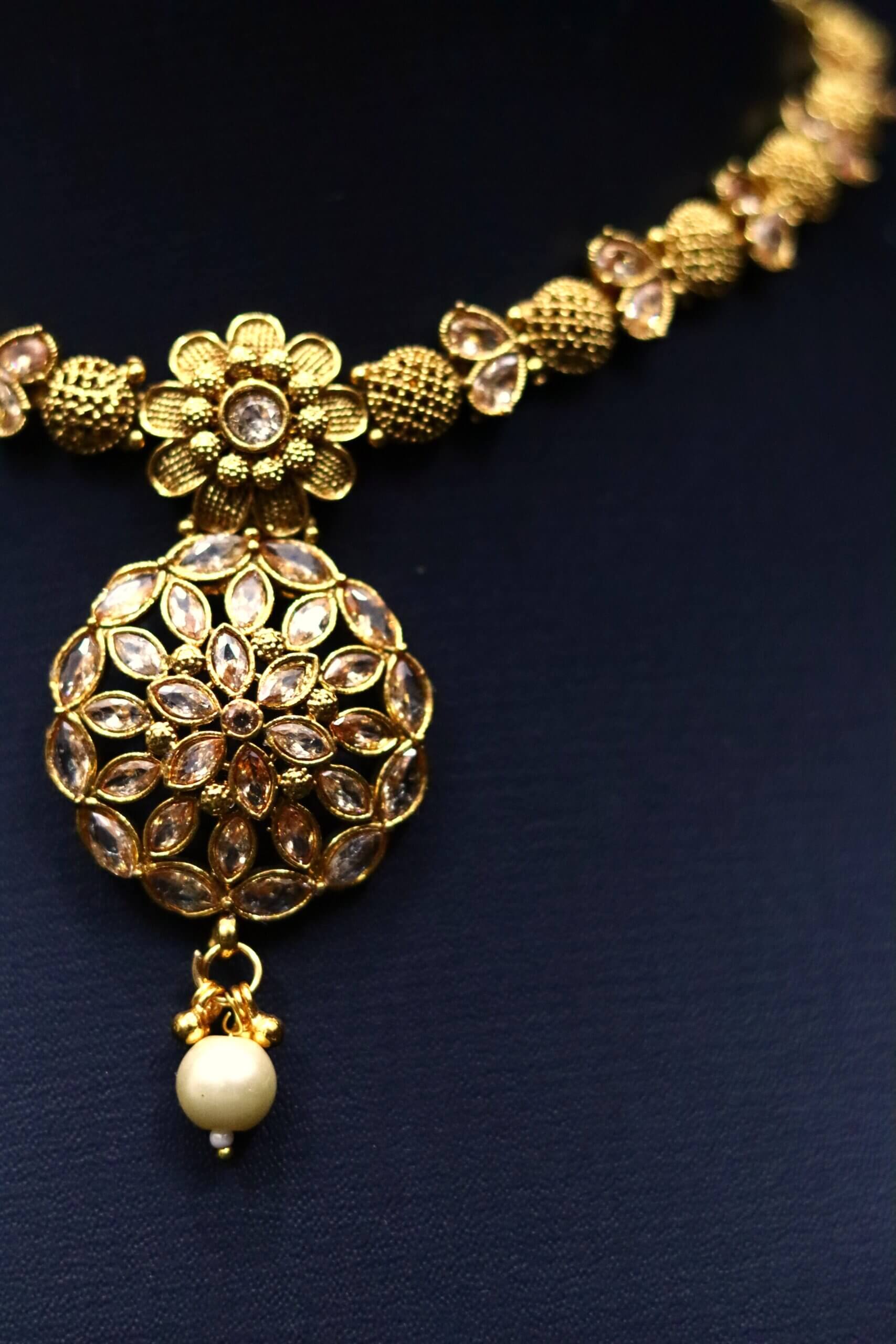 Inspired by the finesse of traditional craftsmanship, this necklace set features intricate floral elements that bloom along the neckline. The grand circular pendant, adorned with kundan-style stones and a lustrous pearl drop, captures the eye with its mandala-like harmony. The matching jhumkis echo this floral charm, bringing the whole set together with poised elegance. Ideal for festive and ceremonial occasions, this piece radiates the spirit of Indian heritage with every detail.