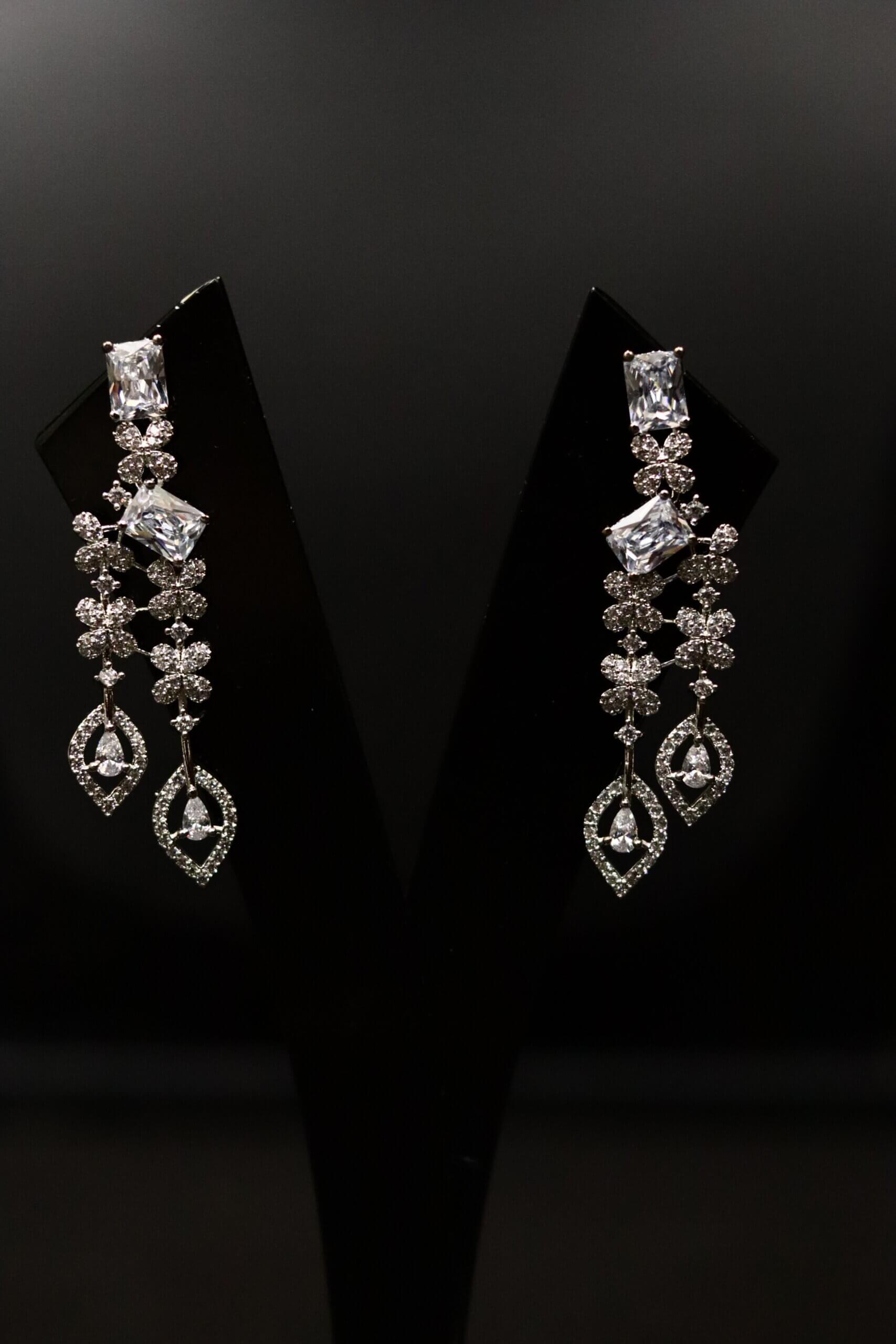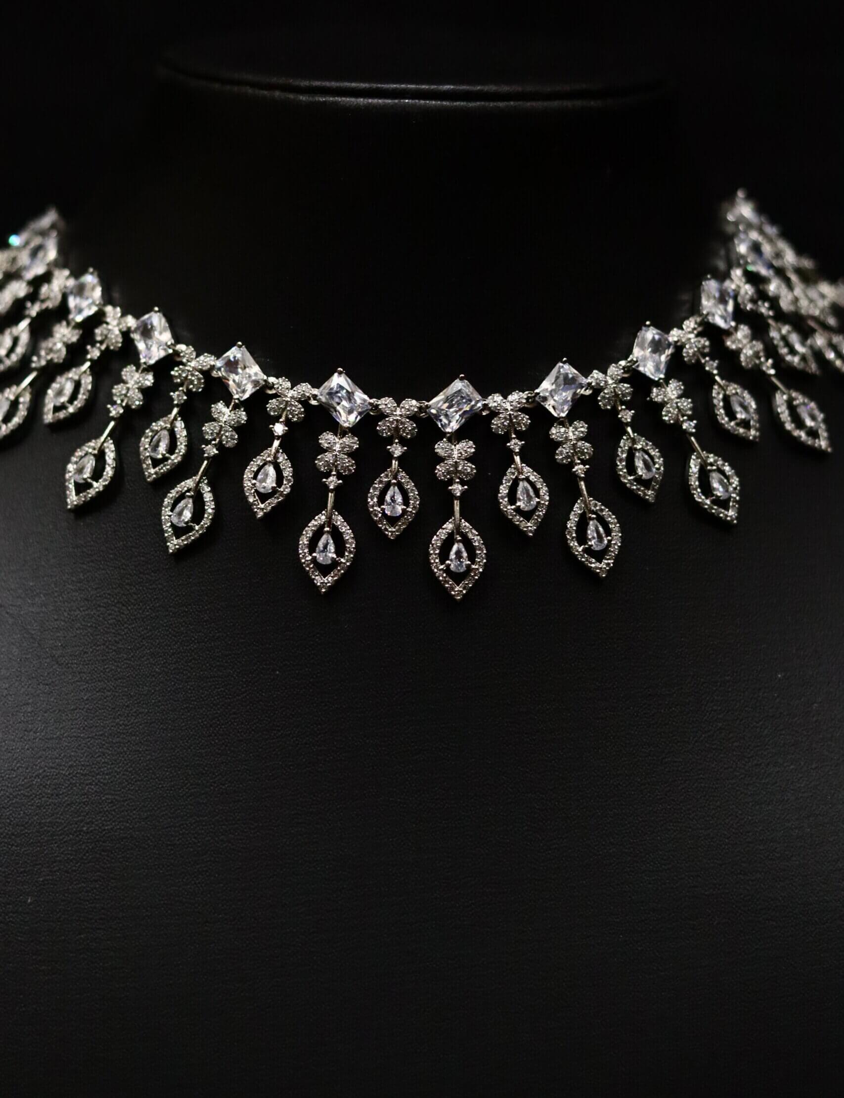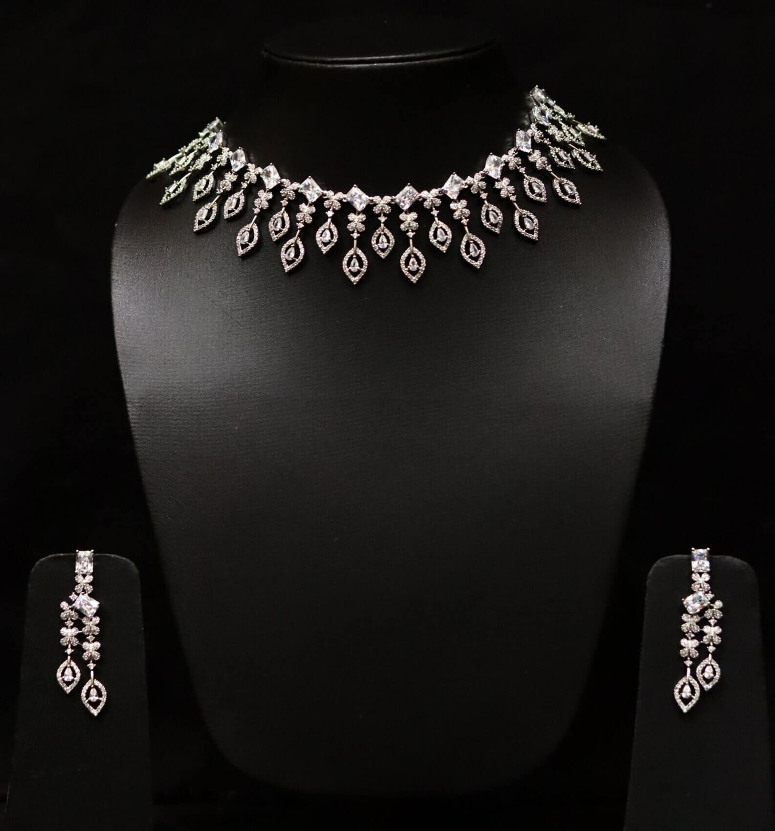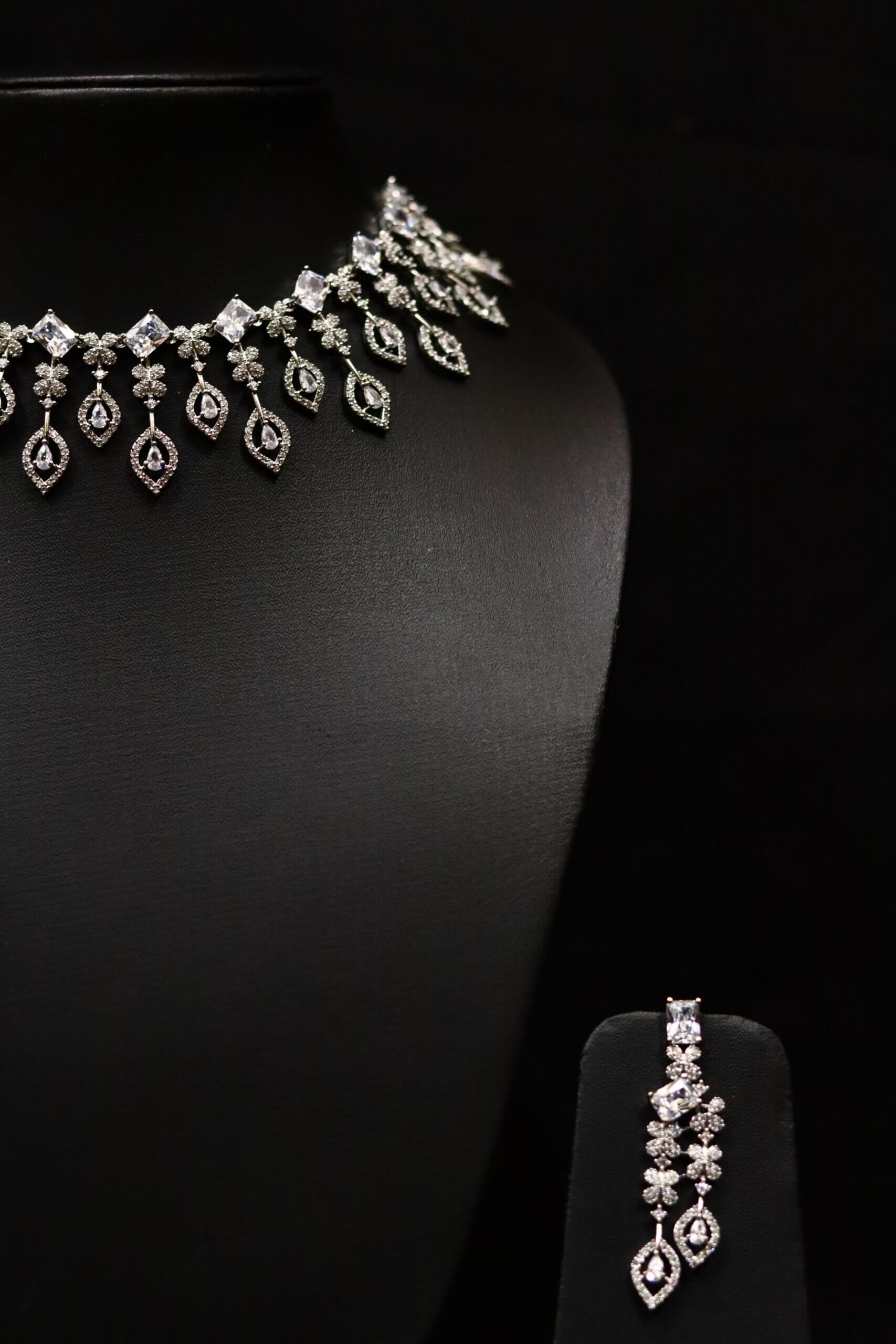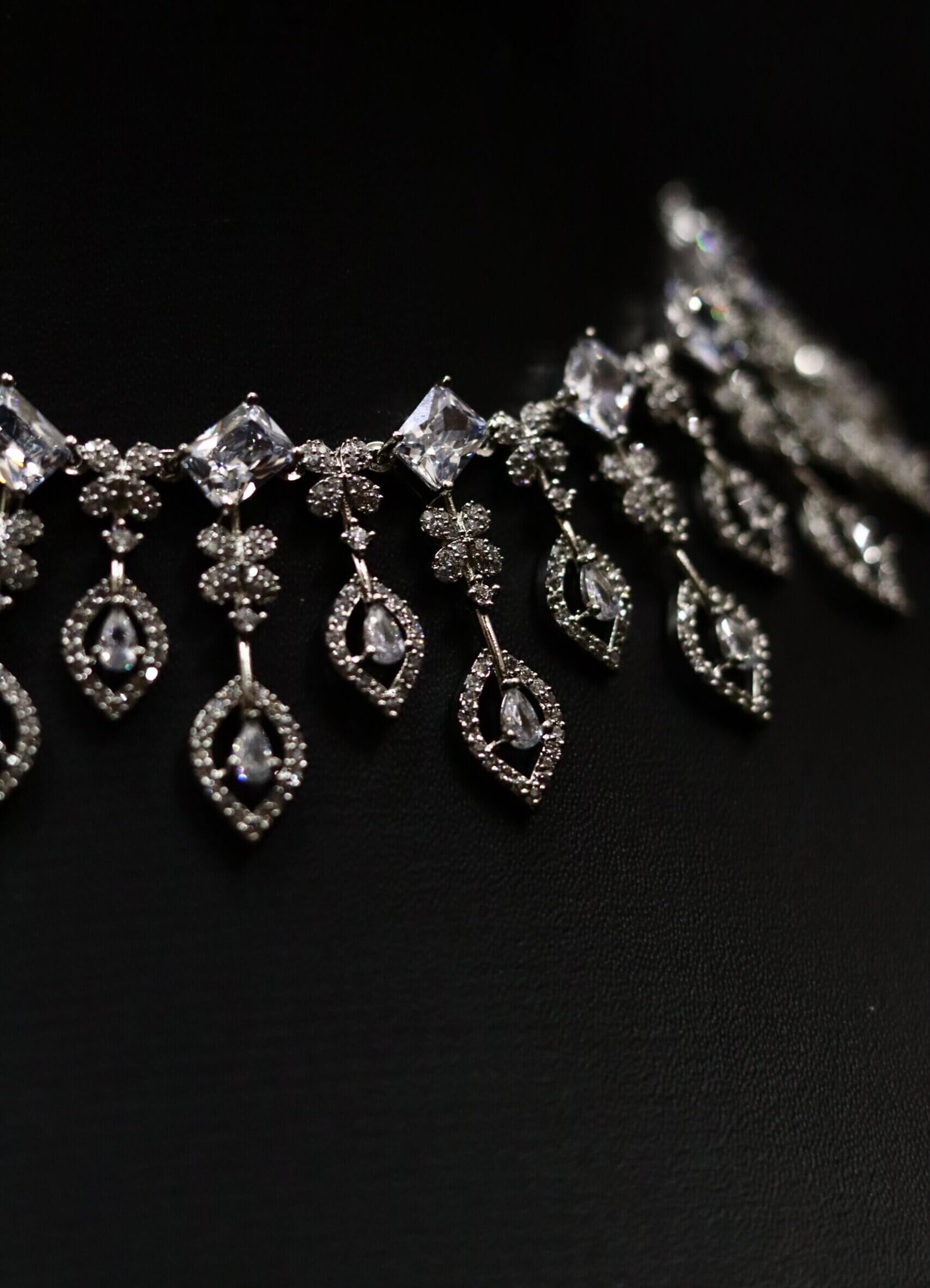 Designed with precision and grace, this radiant collar set features rows of glimmering marquise-shaped motifs, each surrounded by delicate floral accents. The gentle fall of each element creates a soft, cascading neckline—perfectly balanced by long, coordinated earrings that mirror the design.