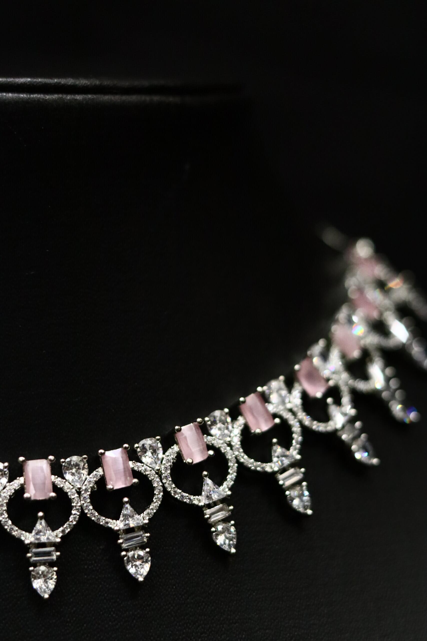 Featuring soft pink gems framed in intricate silver-toned settings, this choker brings a subtle yet captivating sparkle to any ensemble. The tiered hanging drops add gentle movement, while the matching earrings reflect the same elegant geometry in a sleek form. Ideal for light festive occasions and evening celebrations.