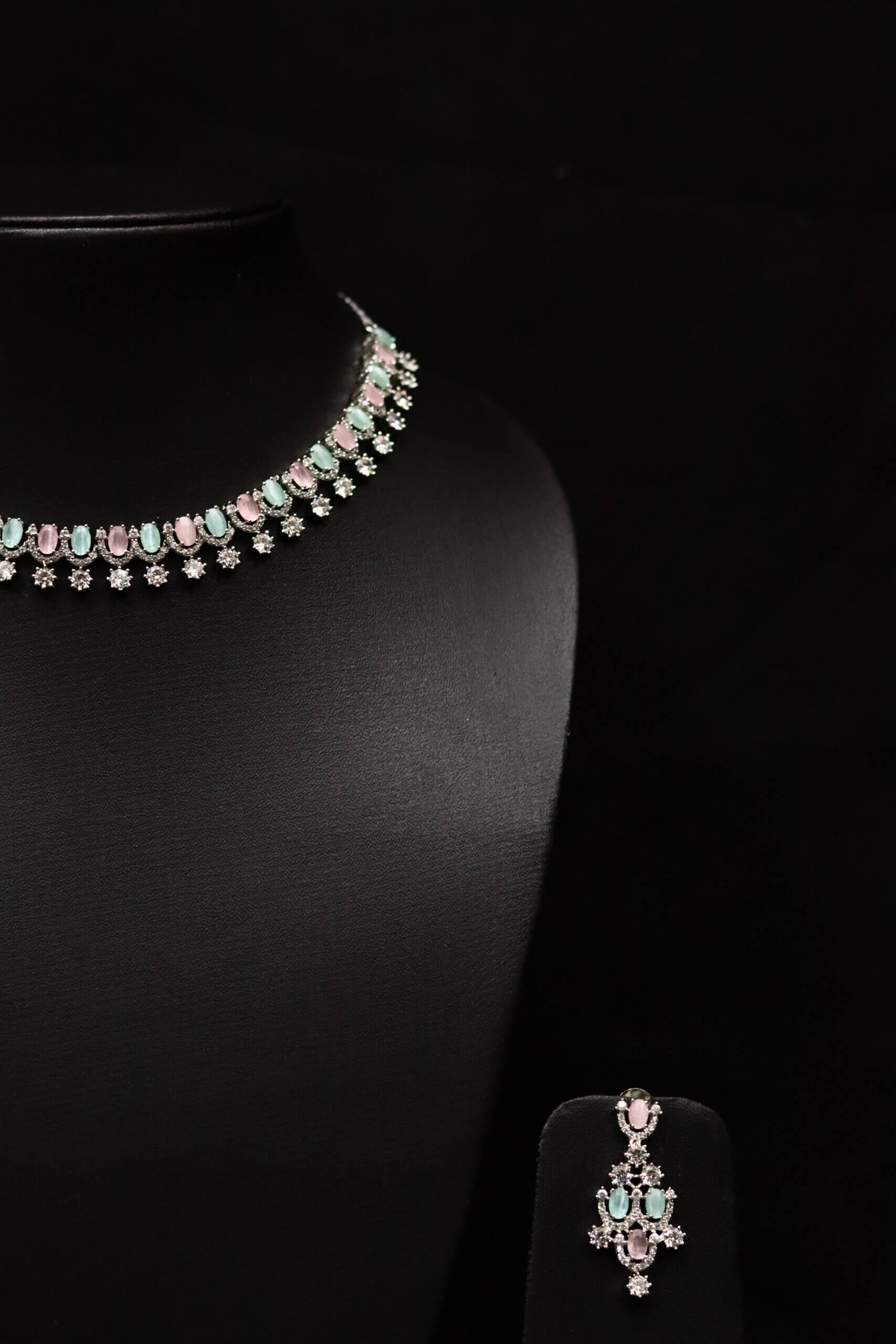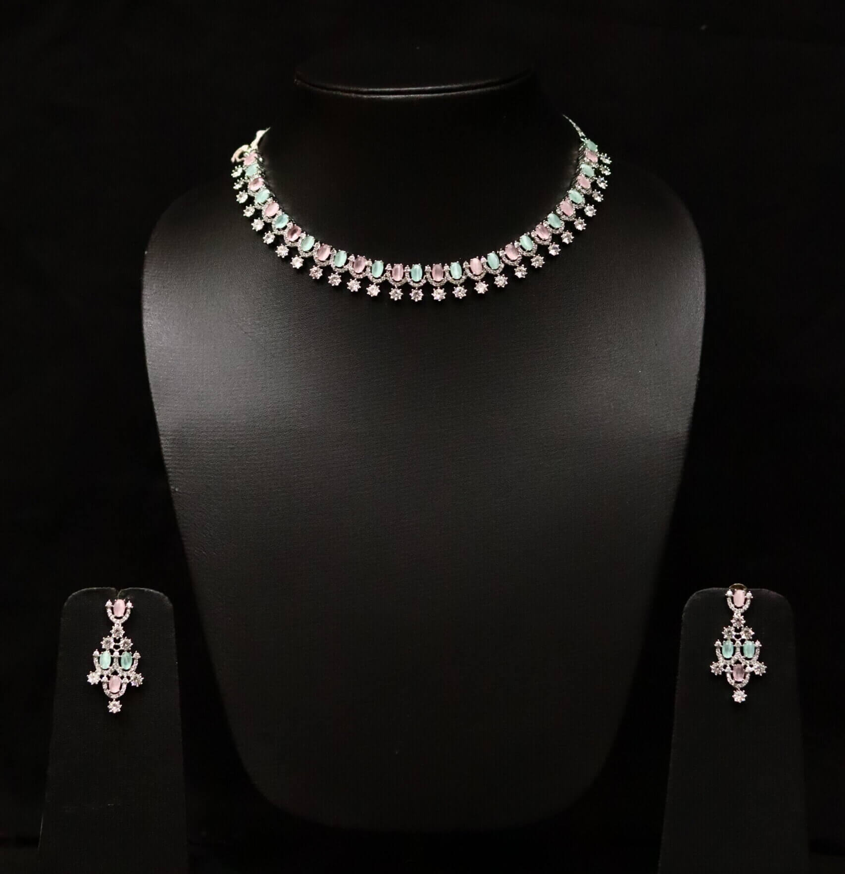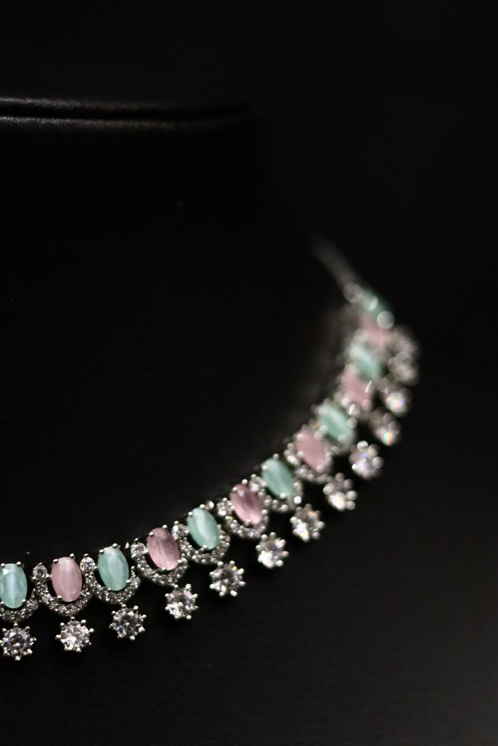 This dainty necklace is a celebration of understated elegance, with alternating blush pink and mint green stones framed by luminous white florals. The structured yet feminine layout creates a fresh and graceful impression. Paired with matching earrings that echo the same pastel harmony, it’s an exquisite pick for day events or intimate gatherings.