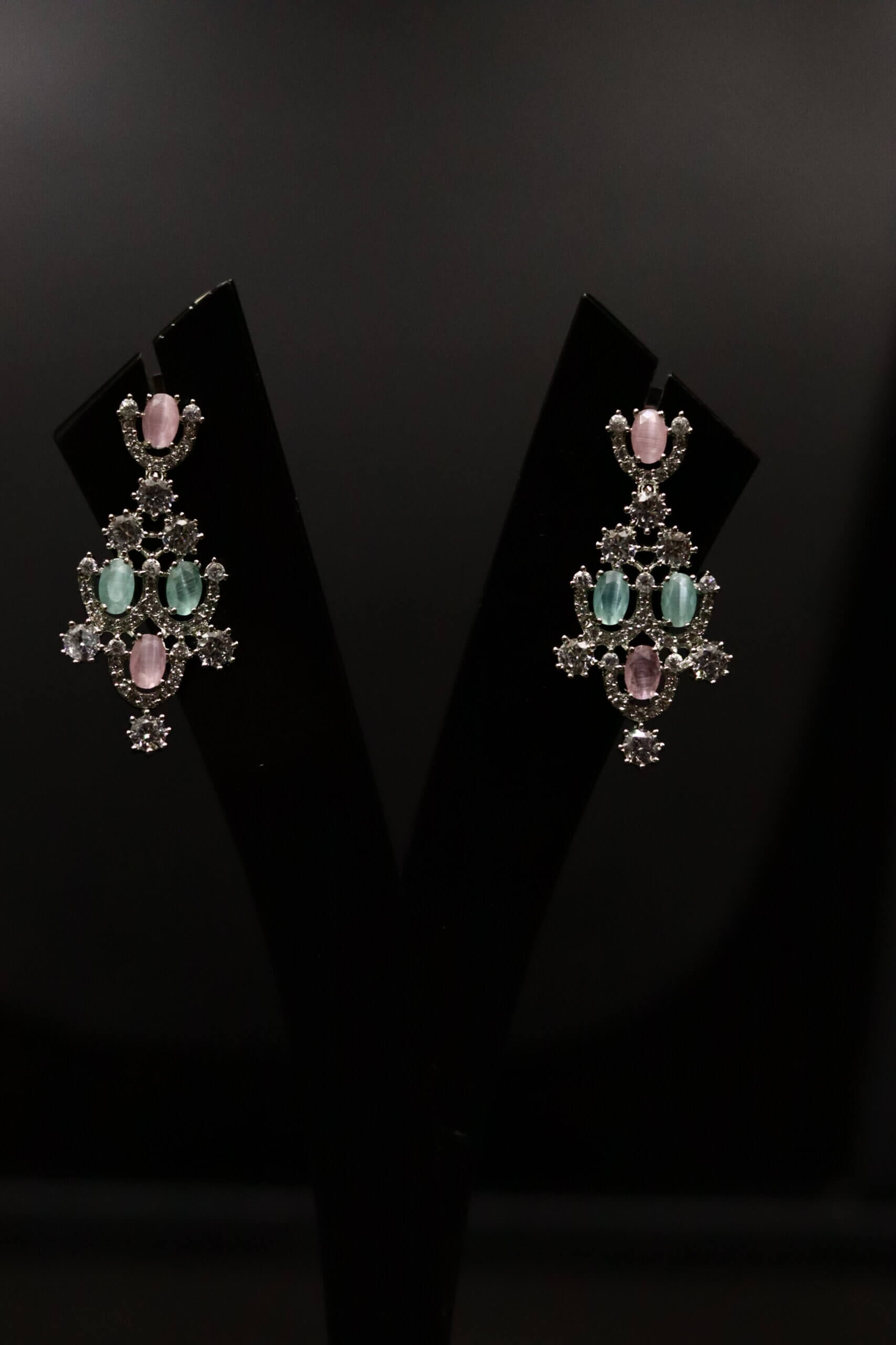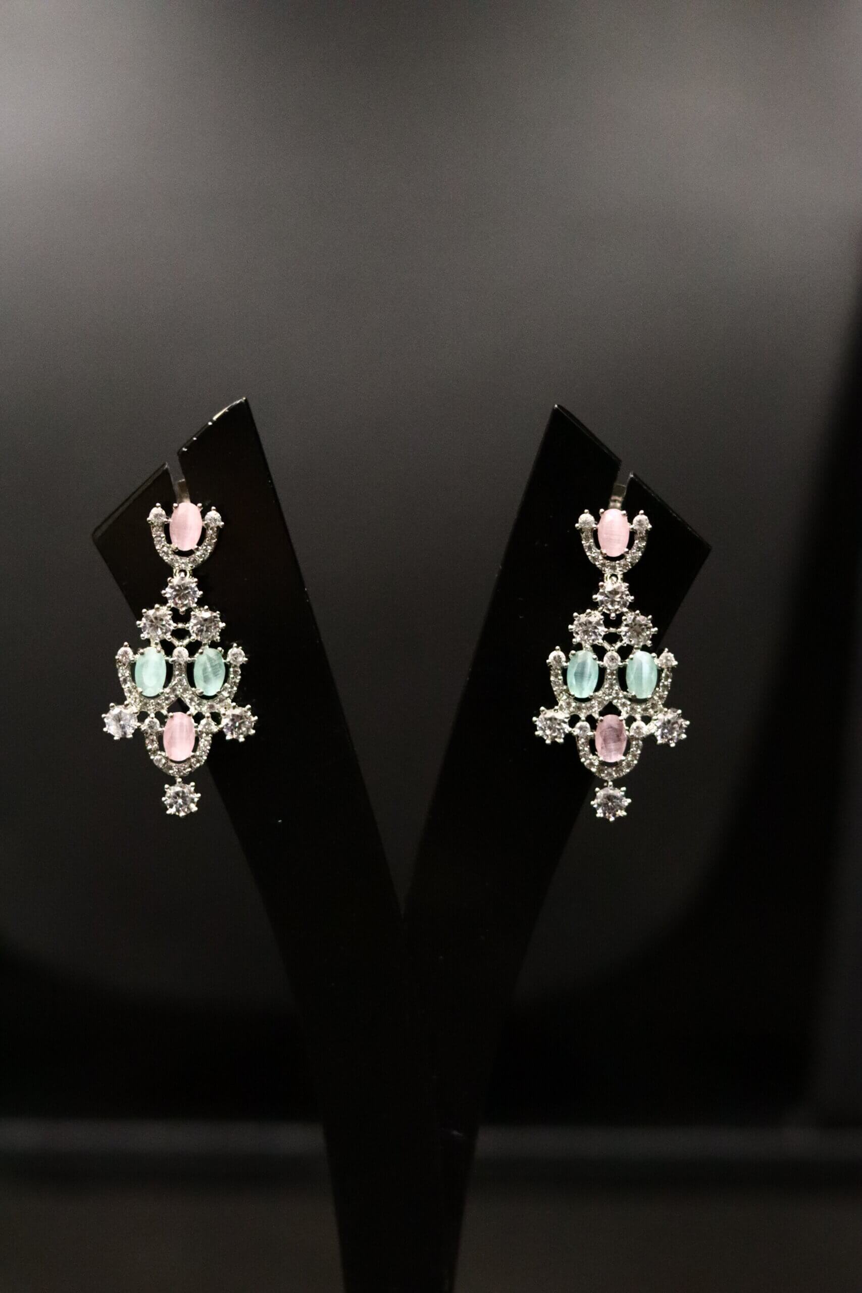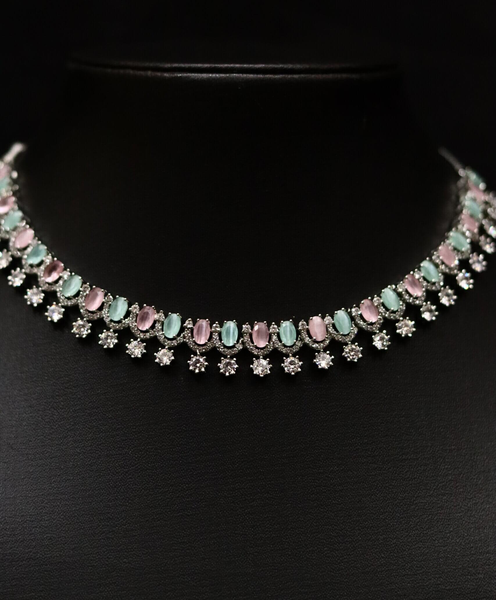 This dainty necklace is a celebration of understated elegance, with alternating blush pink and mint green stones framed by luminous white florals. The structured yet feminine layout creates a fresh and graceful impression. Paired with matching earrings that echo the same pastel harmony, it’s an exquisite pick for day events or intimate gatherings.