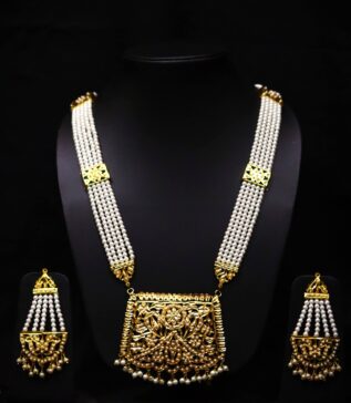 Original price was: ₹ 2,250.₹ 1,575Current price is: ₹ 1,575.A divine fusion of temple artistry and pearl elegance, this necklace set is steeped in regal heritage.